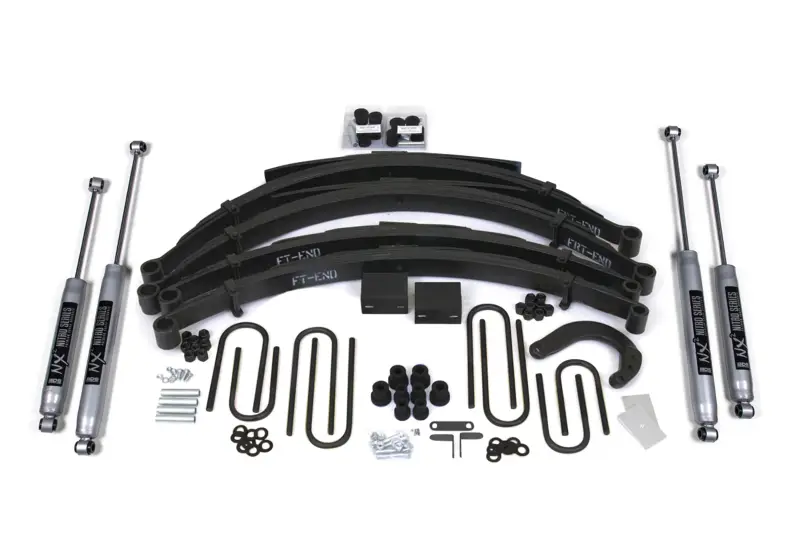 Up front the lift kit includes Glide-Ride leaf springs, 4" steering arm for steering correction, brake line brackets and precision tuned NX2 nitrogen charged shocks. In the rear this kit utilizes a high-strength lift block, longer u-bolts and a matching set of NX2 Nitro shocks.